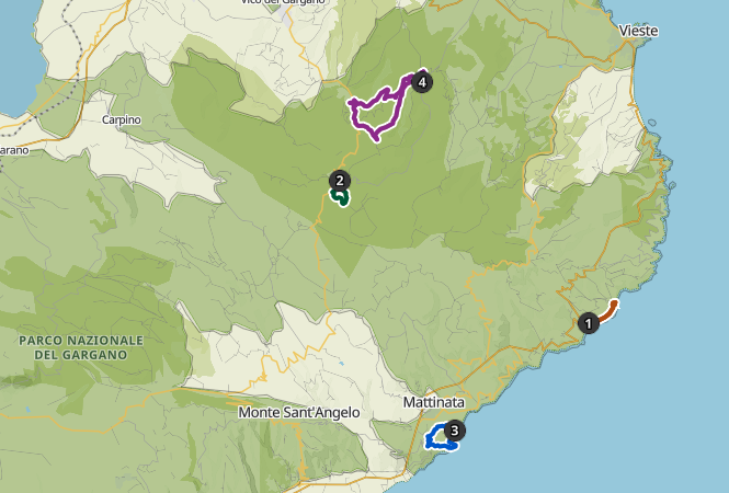 Segui sempre i sentieri segnalati, non lasciare rifiuti e rispetta l’area archeologica e l’ambiente naturale del Parco del Gargano. Alcuni itinerari potrebbero non avere copertura telefonica.